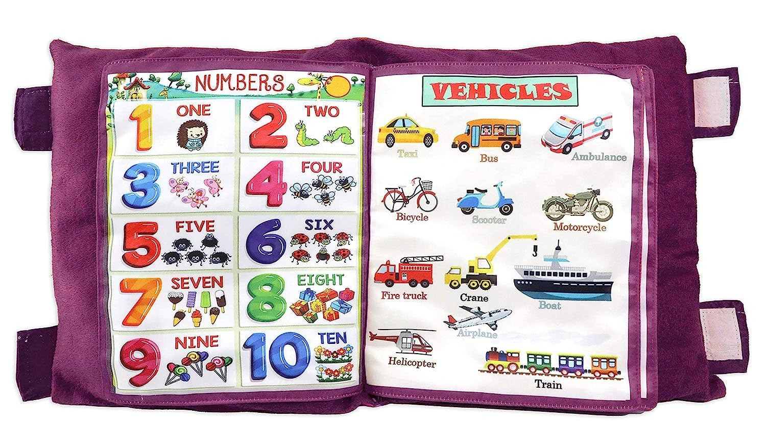 - A cute and fun way for kids to learn. Personalize so the child can learn to spell their name. They can also learn English. Hindi, Gujarati Alphabets, Numbers, Vehicles, Shapes, Colours, Days of the Week, Month of the year, Fruits, Vegetables, Body parts and more with this fun pillow!